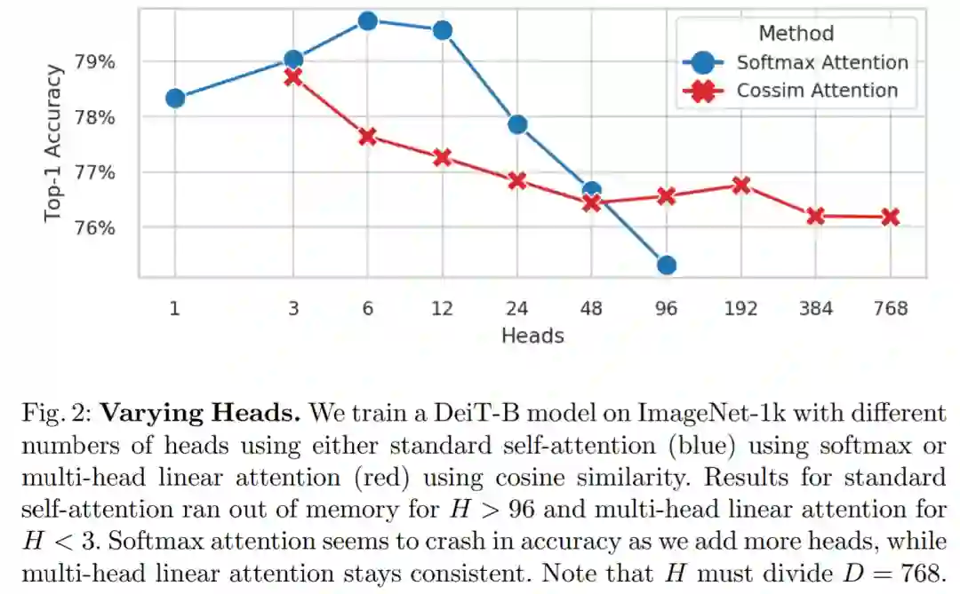 为了找出答案,该研究在 ImageNet-1k 上训练 DeiT-B ,并使用带有 softmax 的标准多头自注意力(公式 5,MSA)或带有余弦相似度的多头线性注意力来改变头数 H (公式 7, MLA) 进行实验,结果绘制在图 2 中。在内存使用方面,MSA 在 H > 96 时内存不足,而 MLA 在 H < 3 时内存不足。
