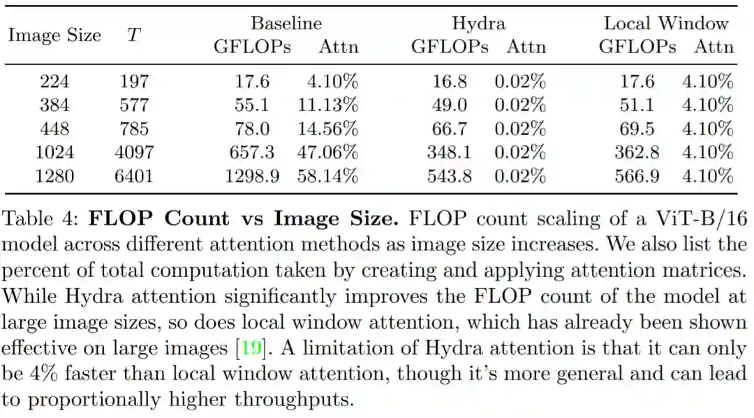 局限性:当 T(token) = 197 时,Hydra attention 比标准注意力快 197 倍,那么为什么最大 FLOP 计数减少只有 4%?事实证明,对于 ViT-B/16 224 × 224 图像(T = 197,D = 768),只有 4.10% 的模型 FLOP 用于创建和应用注意力矩阵。使用 Hydra attention,这一比例降低到 0.02%,基本上消除了模型中的注意力成本。