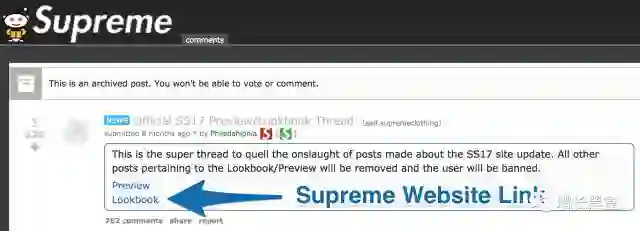 由于第三方具有中立性,版主往往也有比较高的威信,大家关注的角度就从广告转移到一款新产品的讨论。大家也会自然地点击那个Supreme官网链接。