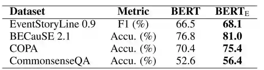 因果知识对于多种NLP任务具有重要意义。因此,e-CARE中包含的因果知识可能能够提升因果相关任务上的模型性能。为了验证这一点,我们首先在e-CARE上微调了e-CARE模型,并将微调后的模型(记作BERTE)分别 迁移至因果抽取数据集EventStoryLine[1]、两个因果推理数据集BECauSE 2.0[2]和COPA[3],和一个常识推理数据集CommonsenseQA[4]上,并观察模型性能。如下表所示,e-CARE微调后的模型在四个因果相关任务上均表现出了更好性能。这显示e-CARE能够提供因果知识以支撑相关任务上的性能。
