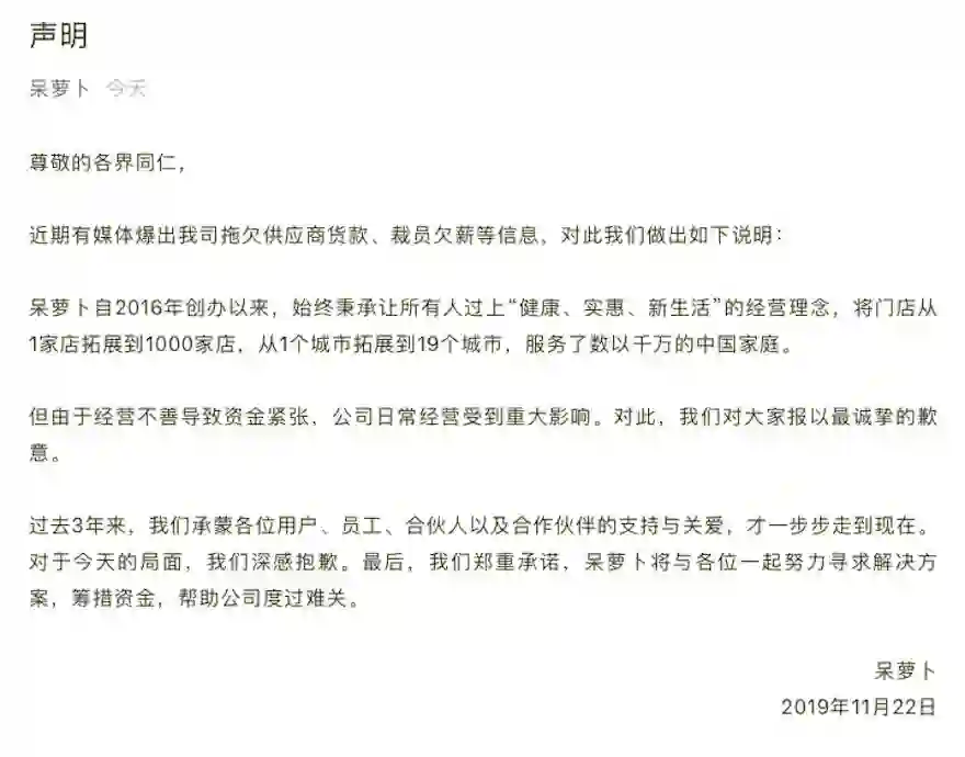 呆萝卜官方微信发布声明称:由于经营不善导致资金紧张,公司日常经营受到重大影响。对此,我们对大家报以最诚挚的歉意。