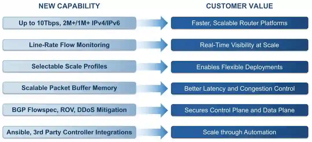 Gandluru解释道:原因就在于之前别无选择。我们现处于一个拐点,使用主干和分支的Clos架构如今在交换和路由领域都被模仿,结合ArcOS的商用硅片大有希望与思科、瞻博及其他厂商的定制ASIC一较高下。因此,现在我们可以采取进攻的姿态,为客户提供成本可能只有思科或瞻博十分之一的路由平台。之前做不到这样。上一代路由芯片没有很多路由功能,比如线速流建模,互联网和骨干网中绝对需要这类功能。现在你拥有这些功能。同时出现了其他事件。首先,路由控制平面从主干或边缘进入到数据中心,使应用程序交互变得容易。然后,商用硅片方面的芯片组赶上并超过了定制硅片。现在你有了控制平面以及更好的ASIC,可以满足所有这些边缘环境的需要。这是降低网络拥有成本的重要因素。”