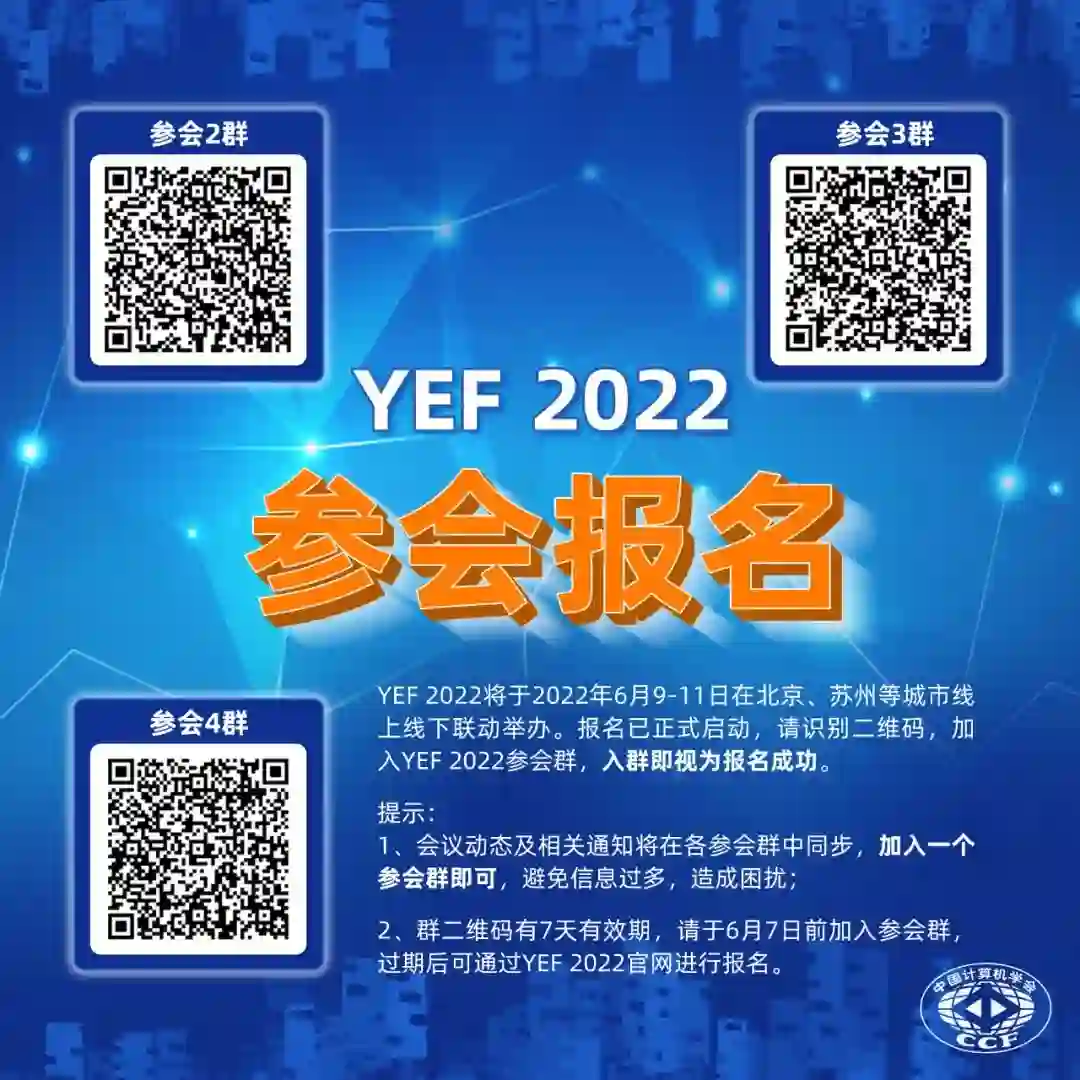 CCF年度盛会——第十二届青年精英大会(YEF 2022)将于6月9-11日在北京、苏州等城市线上线下联动举办,主题是“大计算、大融合”。期间郑纬民院士、张宏科院士等学者将作特邀报告,CCF前任秘书长杜子德、科幻作家郝景芳等嘉宾将在“思想秀”分享洞见,大会同时将邀请交叉学科思辨“计算+”,并举办“科技创业秀”和“大学生学术秀”,以及23场探讨AI、安全、公益等热门话题的观点和技术论坛。