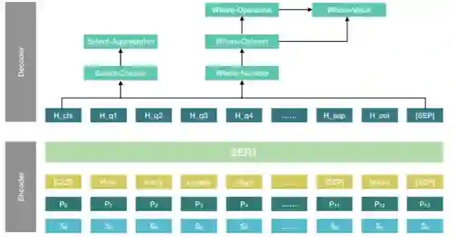 同时,每个子任务按照各自的任务目标设计了不同输出层,例如,Select-Column 的输出层是一个对所有列进行的单分类任务,Select-Aggregation 的输出层是对包括 MAX、MIN、AVG、SUM、COUNT 和空函数进行的单分类任务。不同子任务的分工可以参照下图来理解。