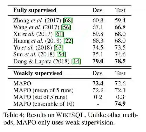 MAPO 在 WikiSQL 上的表现超越了很多有监督学习的算法,如下图所示。
