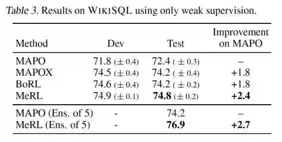 由表中的实验结果可以看到,将 MAPO 与 MeRL 结合,可以显著提升 MAPO 算法在 WikiSQL 数据集上的训练准确率。
