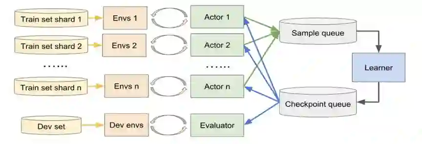 最后,整个 MAPO 算法的计算瓶颈在于对每个自然语言问句采样新程序的过程,针对这个问题 MAPO 算法采用了分布式采样的方案,引入了 Actor-Learner 框架。Actor 有很多个,负责采样产生新程序和与环境交互得到该程序对应的 Reward,Learner 只有一个,用来根据采样结果对策略函数拟合网络进行训练,更新其参数。