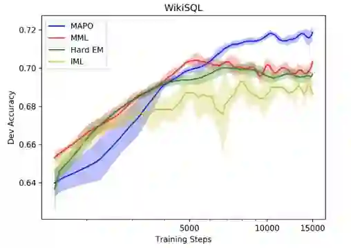 作者将 MAPO 应用到了 WikiSQL 数据集上,对于 WikiSQL 数据及上的每一个样本,都产生 1000 个采样程序,Memory Buffer 中储存 5 个高回报样本,在策略函数拟合网络中应用 GloVe embeddings,LSTM 隐藏单元为 200 个,训练 15000 步。