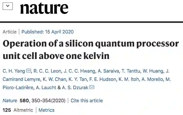 第一个研究来自澳大利亚新南威尔士大学的Andrew Dzurak和Henry Yang领导的团队,题为“Operation of a silicon quantum processor unit cell above one kelvin”。研究团队在1.5开尔文的温度下,在量子处理器上进行了单量子比特运算。
