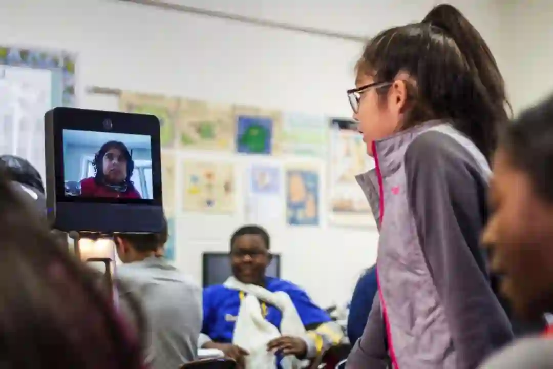 伊利诺伊州常青公园中央中学的一名同学与Max Castillo在六年级社会学课上进行了交谈。Max患有罕见的遗传性疾病,使用移动机器人在不离开家的情况下参加课堂。11岁时,Max Castillo 错过了其他学生的陪伴。几种遗传性疾病使他接触即使悬浮在空气中的小颗粒也会生病。但是在9月份,伊利诺伊州常青公园的中央中学出现了一个重达40磅的Beam机器人。现在,Max可以参加他家的课堂讨论,看看和听到老师和他的同事在做什么。现在Max觉得他再次成为学生团体的一部分。Max通过他的笔记本电脑控制机器人,在学校的助手的帮助下将其从一个班级引导到另一个班级。而Max的脸部视频输入显示在机器人的平板电脑屏幕上。