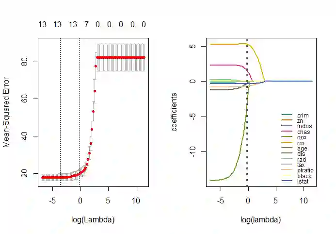 通过前面的学习我们知道,岭回归通过添加回归系数的L2范数对回归系数进行收缩,从而增加估计值的稳定性;LASSO回归则通过添加回归系数的L1范数回归系数进行收缩。不同于岭回归的是,只要惩罚系数足够大,LASSO回归就可把所有系数收缩到0。因此,LASSO回归可以用来进行变量选择,对数据的解释性也更强。然而,LASSO也存在如下不足: