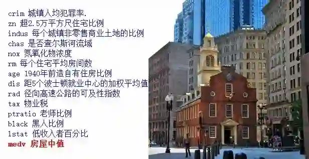 我们使用的是MASS包中的Boston数据集,该数据集记录506个波士顿不同区域的14项社会指标,详细内容见下图所示。我们想通过这组数据探究不同区域的房价中值(mdv)同其他指标之间的关系。