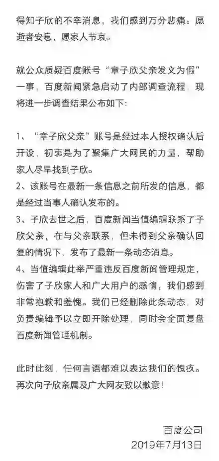 百度表示伤害子欣家人和广大用户的感情,感到非常抱歉和羞愧,已经删除次条动态,对负责编辑予以开除处理,将会全面复盘百度新闻管理机制。