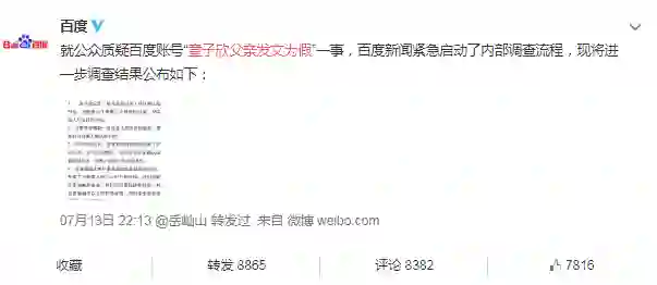 消息发布后,有媒体质疑该消息真伪,在整个过程中,百度先表态“章子欣父亲”账号为真,又在3个小时候承认账号最后一条消息的确是假消息。