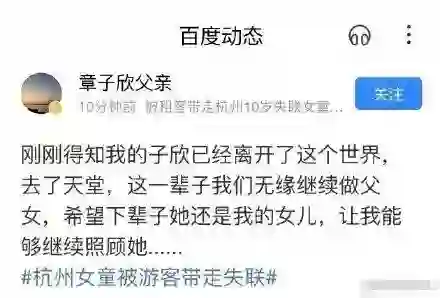 7月13日,章子欣去世消息传出,就在警方尚未认定结果之前,认证为“章子欣父亲”的百度账号迅速发布了一条动态,称“刚刚得知我的子欣已经离开了这个世界,去了天堂,这一辈子我们无缘继续做父女,希望下辈子她还是我的女儿,让我能继续照顾她……”
