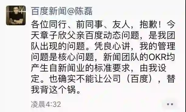 针对此事,百度新闻负责人陈磊次日凌晨在微信朋友圈表示:各位同行、前同事、友人,抱歉!今天章子欣父亲百度动态问题,是我团队出现的问题。凭良心讲,我的管理问题是核心问题,新闻团队的OKR均产生自新闻业的标准要求,由我设定。也确实不能让公司(百度),替我背这个锅。