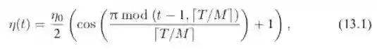 其中,η0 为初始学习率,一般设为 0.1 或 0.2。t 为模型迭代轮数(即 mini- batch 批处理训练次数)。T 为模型总的批处理训练次数。M 为学习率“循环退火”(cyclic annealing)次数,其对应了模型将收敛到的局部最优解个数。式13.1利用余弦函数 cos() 的循环性来循环更新网络学习率,将学习率从 0.1 随 t 的增长逐渐减缓到 0,之后将学习率重新放大从而跳出该局部最优解,自此开始下一循环的训练,此循环结束后可收敛到新的局部最优解处,如此循环往复......直到 M 个循环结束。因式13.1中利用余弦函数循环更新网络参数,所以这一过程被称为“循环余弦退火”过程 (cyclic cosine annealing)[61]。