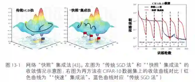 我们知道,深度神经网络模型复杂的解空间中存在非常多的局部最优解,但经典批处理随机梯度下降法(mini-batch SGD)只能让网络模型收敛到其中一个局部最优解。网络“快照”集成法(snapshot ensemble)[43]便利用了网络解空间中的这些局部最优解来对单个网络做模型集成。通过循环调整网络学习率(cyclic learning rate schedule)可使网络依次收敛到不同的局部最优解处,如图13-1左图所示。