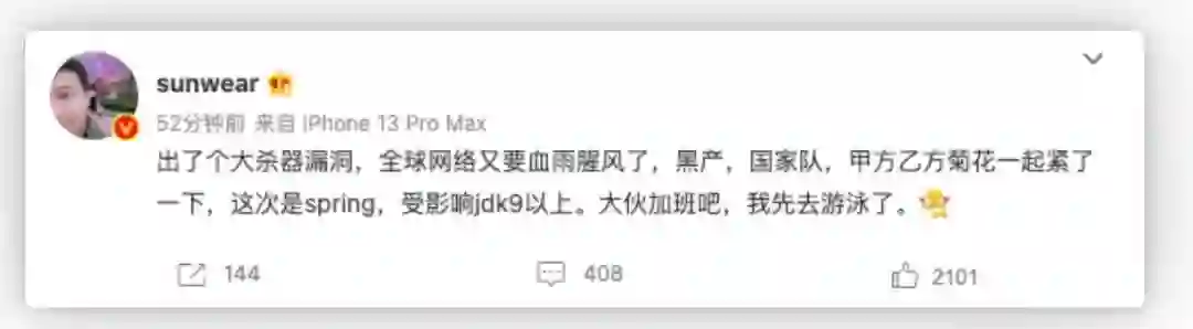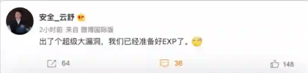 资深网络安全研究专家,默安科技创始人 &CTO 云舒在社交平台表示,“出了个超级大漏洞,我们已经准备号 EXP 了”,有网友问,“有 Log4j 那么大吗?云舒回复:“更大”....