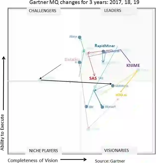 我们将Gartner 2019年数据科学和机器学习平台魔力象限与前两年的版本进行了比较,发现领导者和挑战者出现了显著的变化,包括RapidMiner、KNIME、TIBCO、Alteryx、Dataiku、SAS和MathWorks。