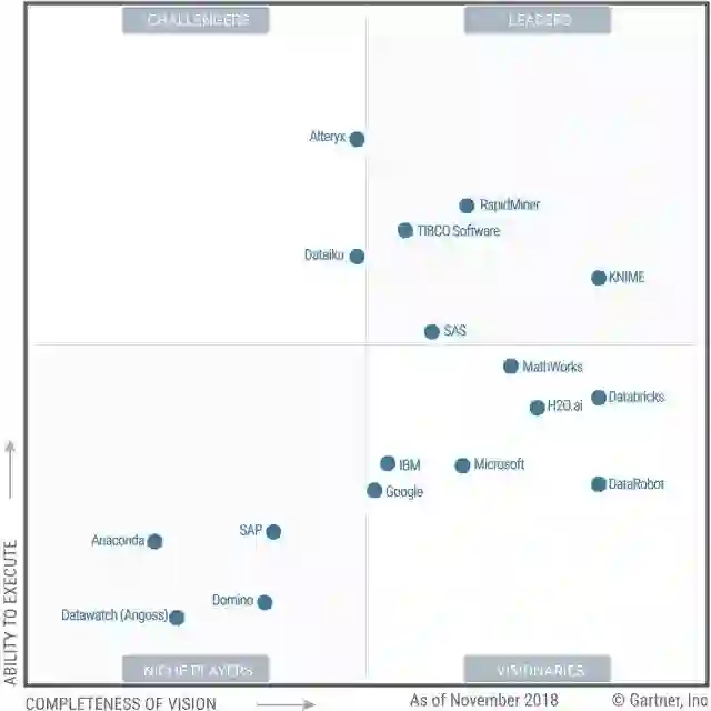 Gartner 2019年数据科学和机器学习平台魔力象限(截至2018年11月)