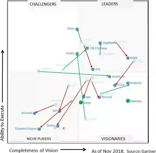 图2显示了比较2018年魔力象限(灰色背景图)和2019年魔力象限(前景图)的结果,箭头连接代表同一家公司的圆圈。如果公司位置大幅改善(远离原位置),箭头标以绿色,如果公司位置下降,箭头标以红色。绿色圆圈表示2家新公司(谷歌和DataRobot),红色X标志着今年跌出象限的供应商(Teradata)。