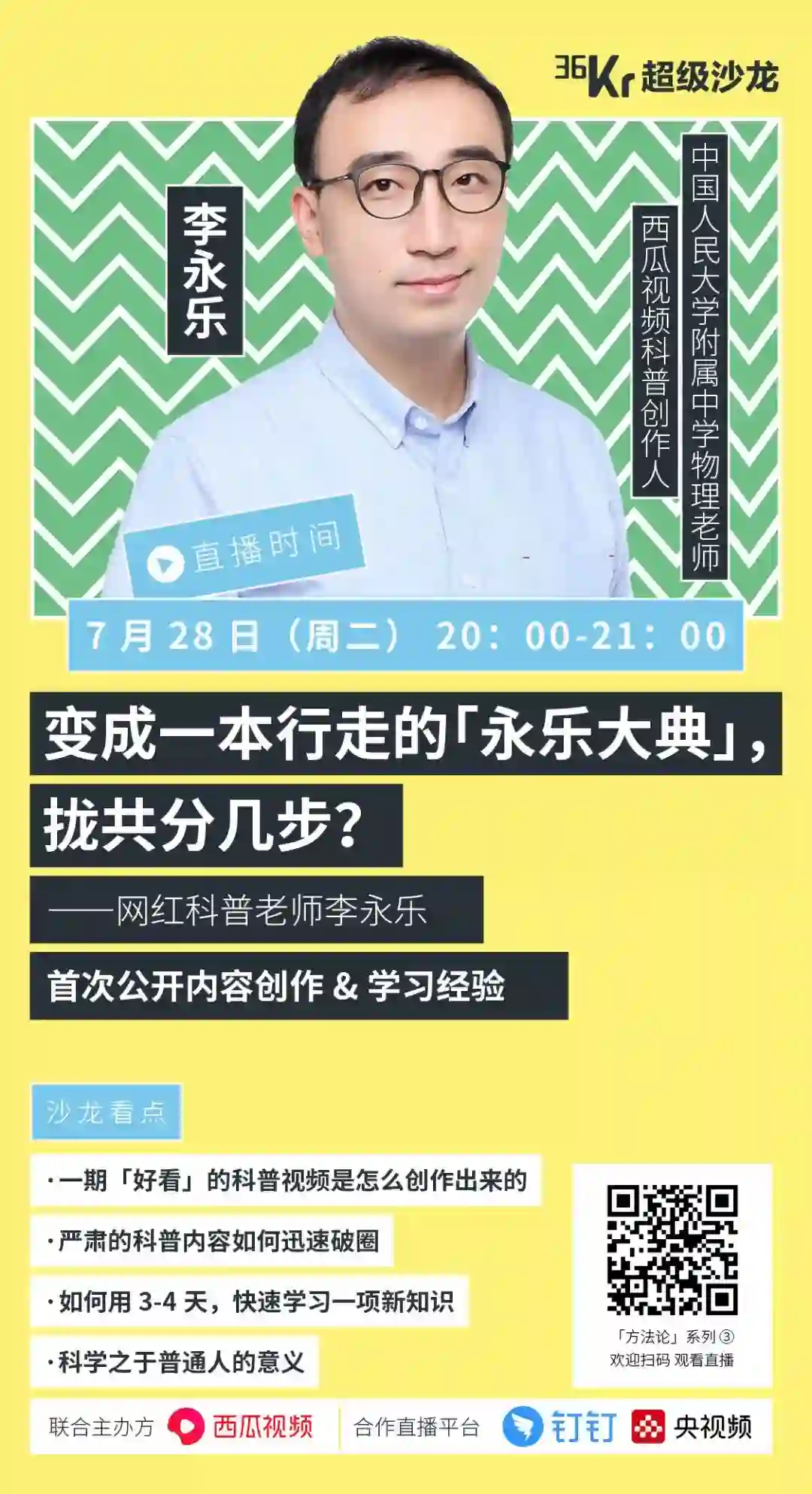 从高中物理老师到坐拥千万粉丝的科普网红,36氪「超级沙龙」邀请李永乐回顾其创作经历,并首次分享爆款内容创作经验,以及如何在短时间内快速学习一门新知识。
