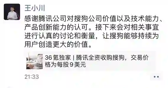 之后,搜狗发布公告称收到腾讯向公司发出初步非约束性收购要约。搜狗CEO王小川随后在微信朋友圈回应称:“感谢腾讯公司对搜狗公司价值以及技术能力、产品创新能力的认可。接下来会对相关事宜进行认真的讨论和衡量,让搜狗能够持续为用户创造更大的价值。”