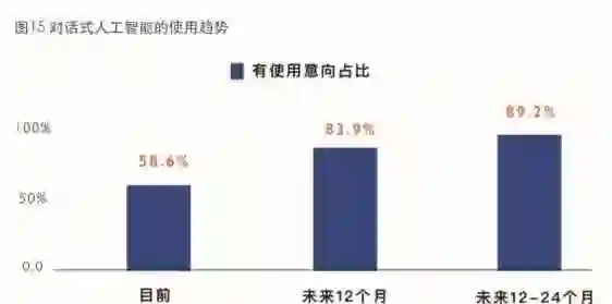 从用户的新产品的采用态度、采用原因等方面给出的反馈来看,用户体检的不断提升正在促进对话式人工智能向前高速发展。在《白皮书》中,IDC公布了他们的调研数据:未来12-24个月,有意向使用对话式人工智能的终端用户将达到89%。因此,IDC认为,在未来,终端用户将大规模的使用对话式人工智能。