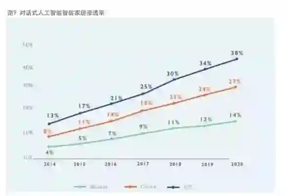 在细分领域内,对话式人工智能已在智能家居、随身设备和智能车载三大领域落地。其中,对话式人工智能在智能家居的带动下,有望发生革命性的变化。从全球发展状况来看,目前美国在对话式人工智能市场处于领先地位,中国随着各大科技巨头的入局以及DuerOS等开放平台的推动,也在奋起直追。预计中国2020年对话式人工智能智能家居的渗透率将达到27%,这一数字虽然低于美国的38%,但却遥遥领先全球平均水平(14%)。