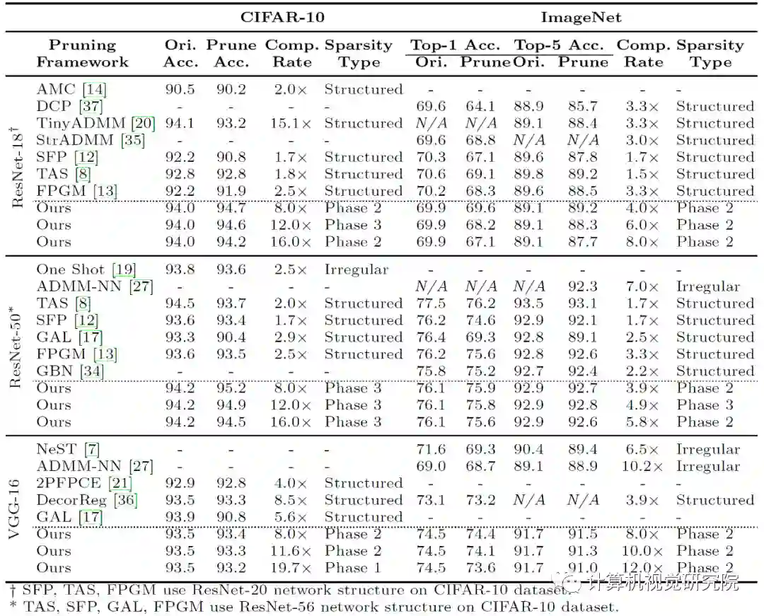 表 1. 基于模式化的剪枝在 CIFAR-10 与 ImageNet 数据集上的剪枝结果对比。