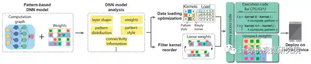 研究人员设计了适合模式化剪枝的移动端推理框架,能够部署并高效执行模式化剪枝后的