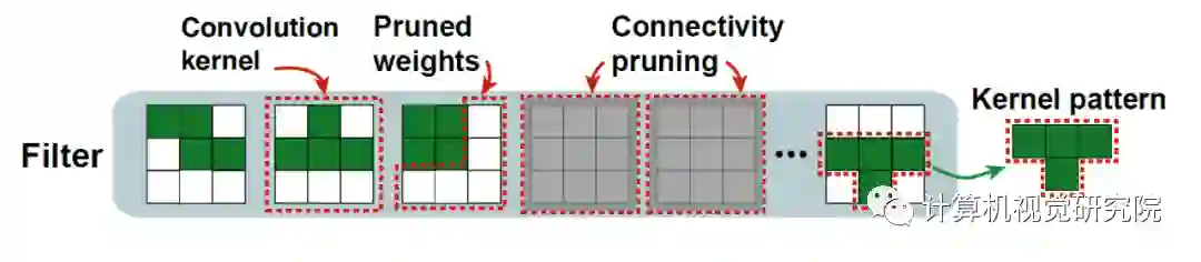 如图 2 所示,模式化剪枝中包含了两种卷积核层面的模型稀疏化方法,即卷积核(convolution kernel)模式化剪枝(pattern pruning)与连通性剪枝(connectivity pruning)。