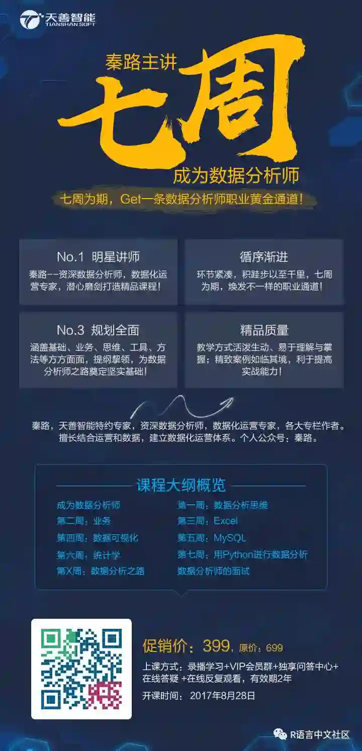 天善智能年度数据分析扛鼎之作,秦路主讲,七周成为数据分析师课程。