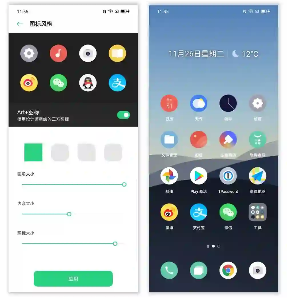 所以这次的 ColorOS 7,直接内置了针对桌面图标和切换动画的自定义功能,不管是图标大小、形状、排列,均可以自己定制。