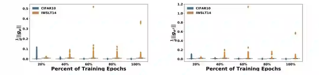 上图中,蓝色是ResNet20在Cifar-10做图像分类的结果,橙色是Transformer+BN在IWSLT14做翻译的结果。X轴是训练时间,Y轴是基于batch的统计值和它对应的移动平均值的欧式距离。