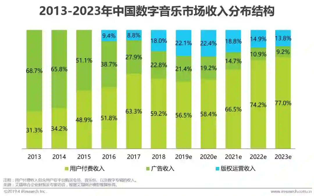 经过2014至2016年高速增长的爆发期和2017年增速放缓的探索期后,数字音乐市场于2018年回归稳定,形成了以用户付费为主,版权运营和广告收入为辅的盈利模式。