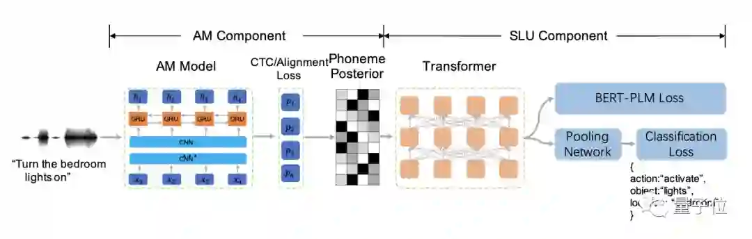 聂再清解释,比如输入“liangzhu”这个语音信号,通过声学模型,就可以计算出一个音素后验矩阵。在这个时候,模型并不需要马上判断“liangzhu”到底是指音乐里的“梁祝”,还是建筑里的“梁柱”,而是可以在音素后验的基础上去做意图分类、语义分类。