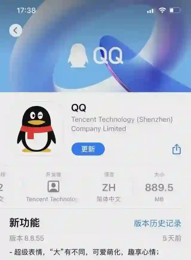 不久前,手机QQ发布8.8.55版本升级,软件显示,Android版安装包大小为371MB,而令人惊讶的是,iOS版则直接逼近1GB,达到了889MB。