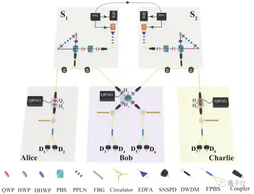 一对分别发给Alice和Bob,另一对发给Bob和Charlie,三方对测量结果做交叉对比。