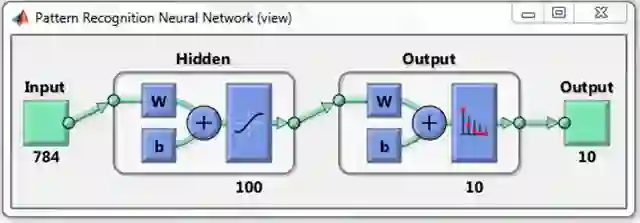 这是你通过图片识别工具创造的人工神经网络模型图表。他有784个输入神经元, 100个隐藏层神经元,以及10个输出层神经元。