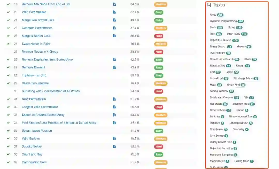 规避挫折法 Leetcode 很人性化的把题目的难度划分为:容易题,中等题,难题。为了避免刷题时候,身心受到打击摧残,只做简单题。该法对心理脆弱、亟需成就感同学最佳。