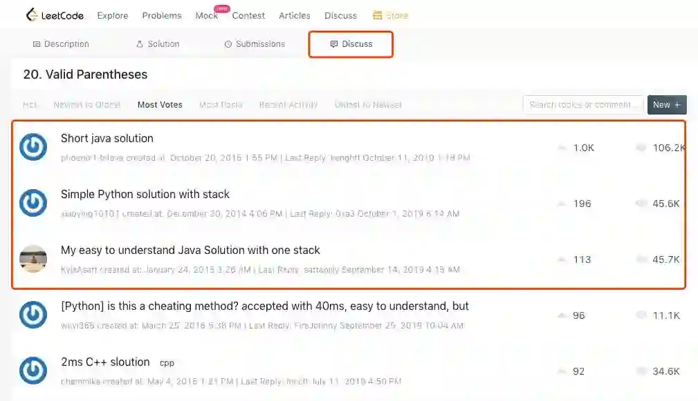 每道题目都有一个 Discuss 讨论模块,我们点击进去,会发现,这里贴满了前人发表的各种解决方案,排名靠前的,一般是最为优秀的,或是时间和空间复杂度消耗很低,或是代码实现优美,思路清晰易懂。
