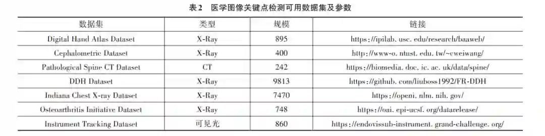 利用深度学习进行医学图像关键点检测时,获取 大规模的学习训练样本数据集非常困难,且需要临床 专家标注,因此目前公开可用的医学图像关键点检测 数据集偏少,为了解决数据集的限制,可以从两个方面 尝试解决大规模的医学数据标注样本数据的问题. 一方面,医学图像领域的挑战赛及大型公开数据 集的出现对医学图像分析的发展有着极大的帮助,自 2007年以来,MICCAI、ISBI 和 SPIE 等医学成像研讨会 组织挑战赛数据集已经成为惯例,开放了大量用于基 准研究的医学数据集[56] ,收录在网站http://www. grandchallenge. org/. 另外通过追踪相关研究文献中研究者 们给出的数据集,表2给出本文整理的可用于医学图像 关键点检测的图像库及其链接.