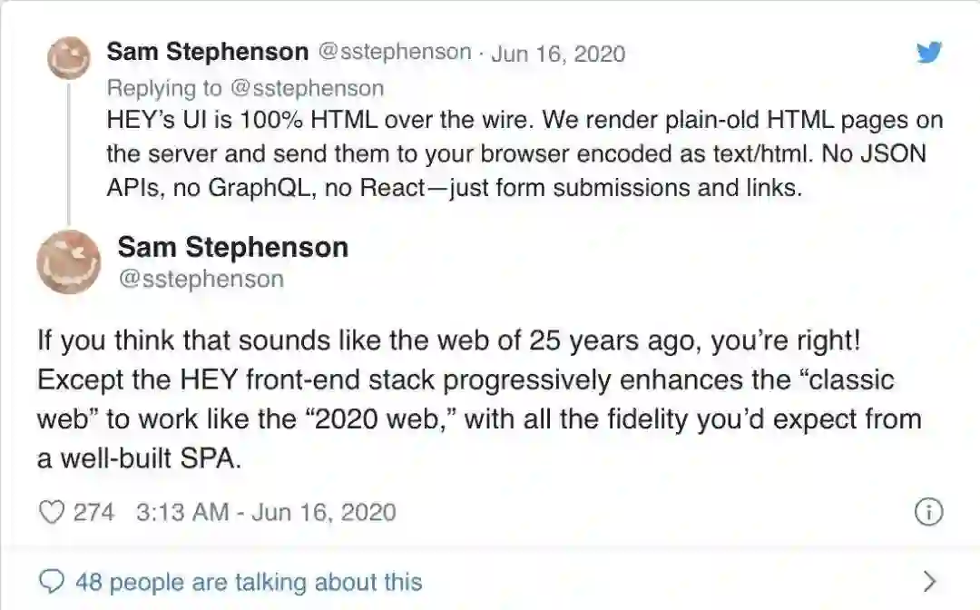 伴随着 Phoenix Liveview 或 hey.com 等项目最近提出的“纯 HTML”方法,似乎服务端渲染(SSR)又一次成为了人们关注的焦点。