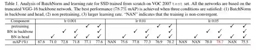 沿着这个思路我们在 SSD300 检测框架上给 VGG 网络与检测子网络分别加上了 BN 来进行随机初始化训练(PASCAL VOC 07+12 训练,07 测试),调整学习率之后,得到的最好结果 78.7mAP,比直接随机初始化训练 SSD 的结果(67.6)高 11.6,比原 SSD300(77.2)高 1.5,比使用预训练模型 VGG-16-BN(78.2)高 0.6。实验细节在论文的实验部分有描述。