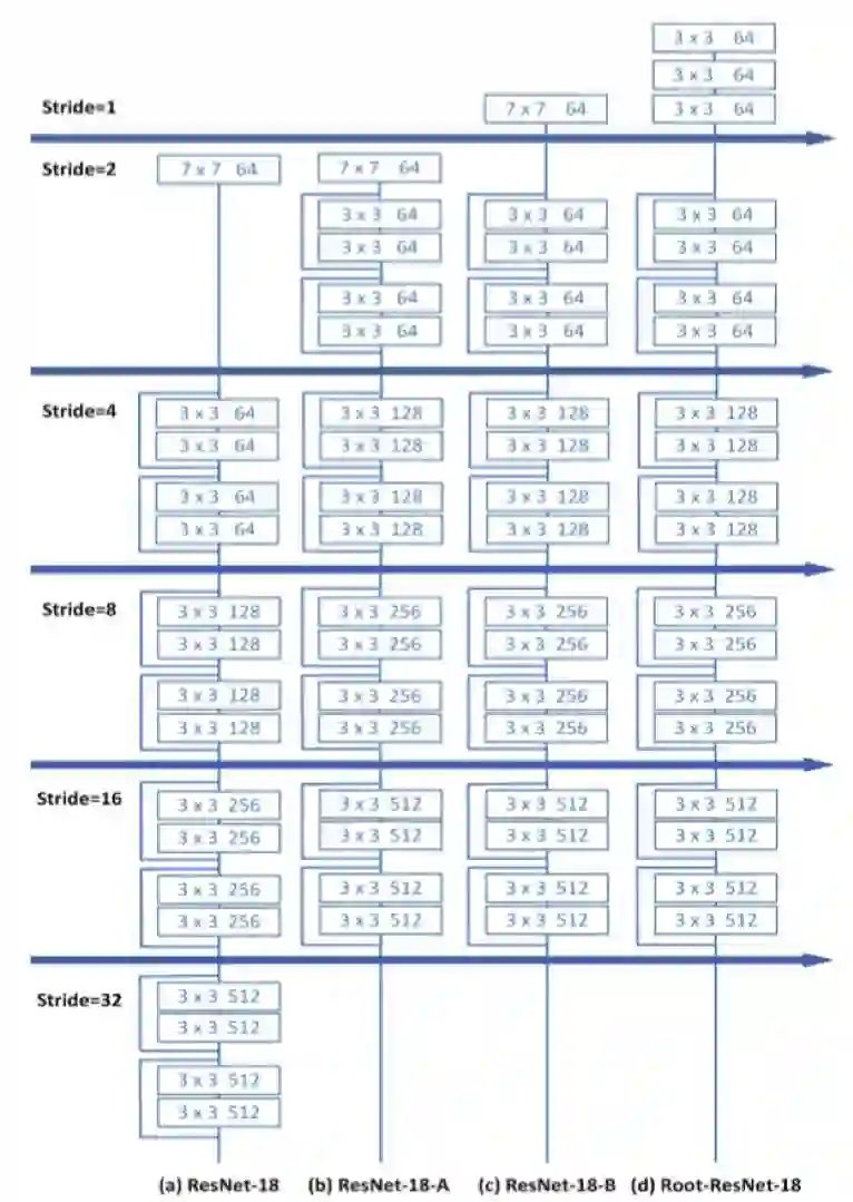 (d) Root-ResNet-18: 将 ResNet-18-B 的第一个 7x7 卷积核替换成 3 个 3x3 卷积,结果为 78.5mAP。