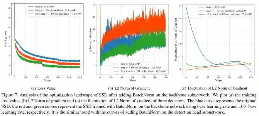 从左到右的 3 幅图分别是训练 loss,梯度的 L2 Norm,梯度的波动程度。通过这三幅图能够从优化角度分析,为什么 BN 能够帮助随机初始化训练检测器,蓝色曲线代表直接对 SSD 使用 0.001 的学习率做随机初始化训练,红色曲线在蓝色曲线的基础上在 VGG 网络上加了 BN,绿色曲线在红色曲线的基础上使用了 10 倍的学习率。可以看到:从蓝色到红色,给特征提取网络添加了 BN 之后,梯度的波动程度大幅下降,梯度趋于稳定,优化空间更加平滑,训练 loss 下降,mAP 从 67.6 升高到 72.8。而从红色到绿色,平滑的优化空间允许使用更大的学习率,loss 进一步下降,mAP 也从 72.8 升高到 77.8。我们在检测子网络(detection head)也做了一样设置的实验,得出了相似的结论与梯度分析图,具体请参考论文。