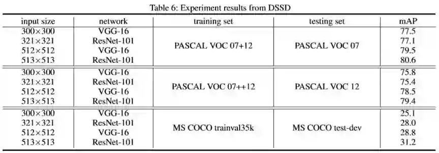 在 SSD 的升级版论文 DSSD 中,我们将 SSD 的特征提取网络从 VGG-16 替换成了 ResNet-101,所得实验结果汇总如下表: