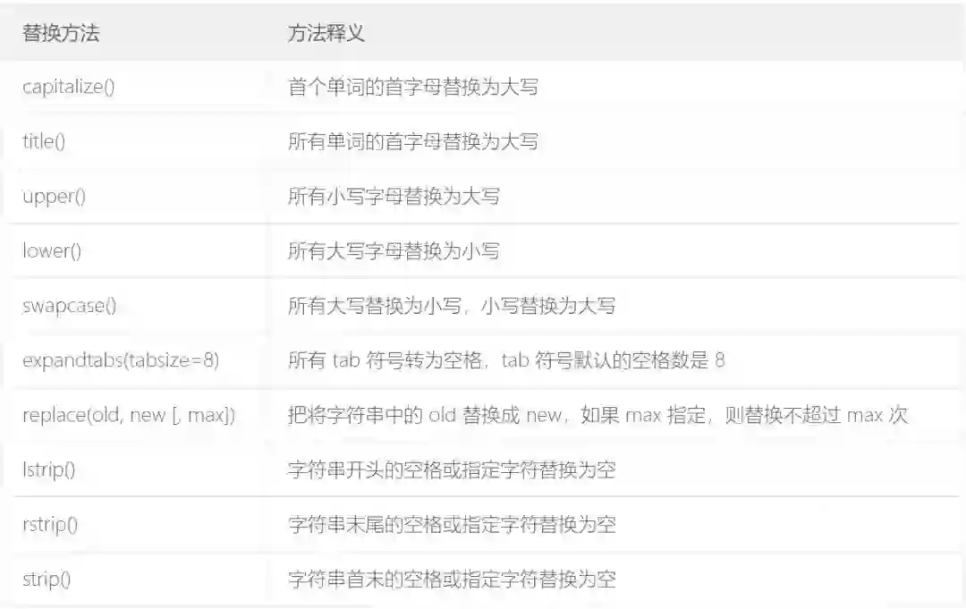 以上这些方法都很明了,使用也简单,建议你亲自试验一下。这里只说说 strip() 方法,它比较常用,可以去除字符串前后的空格,不仅如此,它还可以删除首末位置的指定的字符。